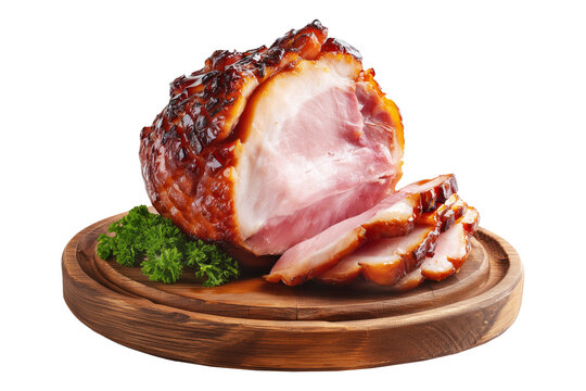Maple baked glazed ham partially sliced with parsley garnish on wooden board, isolated on white transparent background.