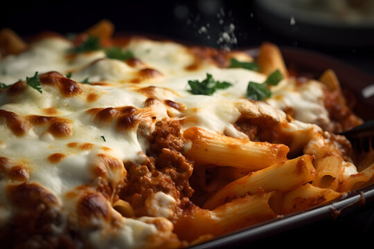 baked ziti. A close up magazine quality image of a casserole of baked ziti with sausage