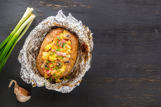 Baked potatoes in foil with bacon, onions and mushrooms on a gray wooden table. Copy space. Top view