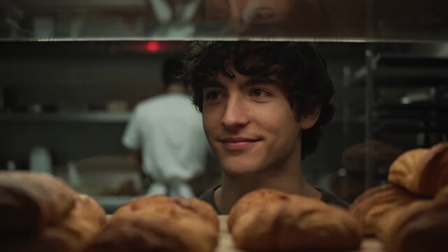 Young man smiling happily behind a bakery counter with fresh croissants.