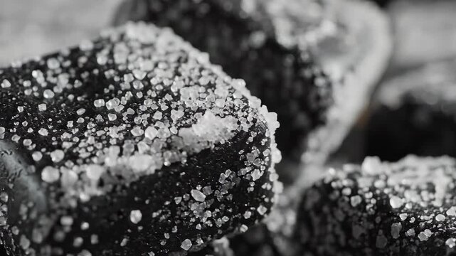 A captivating closeup black and white macro shot revealing the intricate texture of a delicious baked treat generously coated with sparkling sugar crystals highlighting its tempting granular surface .