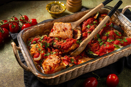 Baked chicken with vegetables preparing in the oven at baking sheet. Top view.