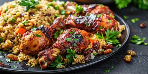 Close up of baked chicken drumsticks served with brown rice pilaf vegetables and raisins on a black platter on a dark wooden table