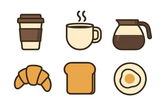 Coffee and breakfast icons set. Minimalist vector cartoon illustration of food and drink essentials. Morning meal symbols like cup, mug, croissant, toast, egg, and pot.