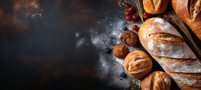 Variety of bakery ingredients and products, including bread, flour, nuts, and pasta, are artfully arranged on dark surface, showcasing diversity and richness of baking essentials