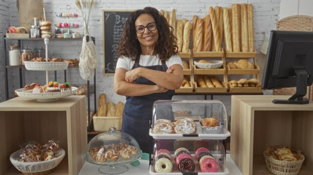 Hispanic woman in a bakery shop standing behind the counter with pastries and bread, wearing an apron and glasses, smiling while surrounded by an indoor shelf of various baked goods.