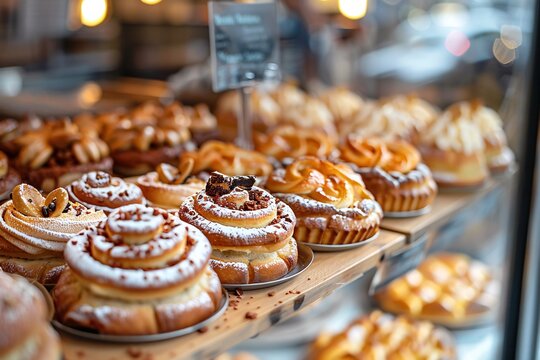 A charming bakery showcases an array of tempting pastries and cakes in a beautifully decorated setting A charming bakery with delicious pastries and cakes on display
