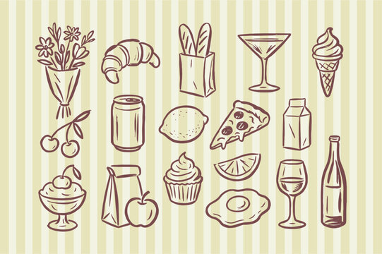 Set of simple line art icons of sandwiches and bakery items