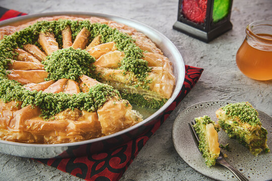 Middle Eastern traditional  dessert "Baklava" or "Baklawa". Served in baking tray and topped with delicious crushed pistachio.