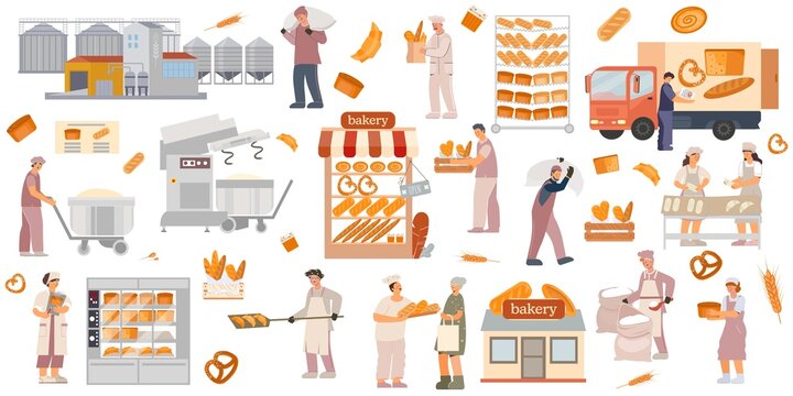 fröhliche Arbeiter bei der Herstellung von Backwaren und Broten in einer Großbäckerei // cheerful workers in the industrial production of bread in a bakery
