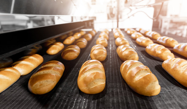 Freshly baked bread rolls on a conveyor belt in a bakery factory.