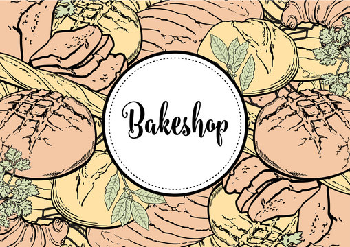 Bakery background. Hand drawn cooking bread bakery bagel breads pastry bake baking culinary vector menu design