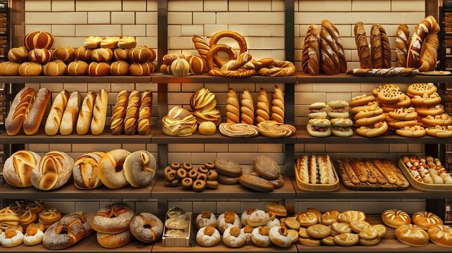 Bakery shop display Bakery products on shelves and counters Shelves with different sorts of bread buns and pretzels Beautiful shop display of baked products German modern bakeshop with : Generative AI