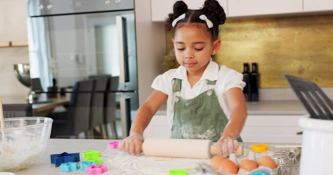 Happy girl kids baking cookies with rolling pin in kitchen, house and home for childhood fun, learning and development. Young toddler child playing little cooking chef, baker and sweets dessert dough