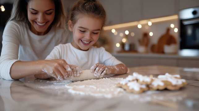 A joyful scene of a child rolling dough with their mother, highlighting the warmth and excitement of holiday baking together, filled with laughter and the spirit of family traditions.
