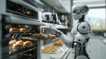 A futuristic robot baking pastries in a modern kitchen, showcasing advanced technology in culinary arts and automation.