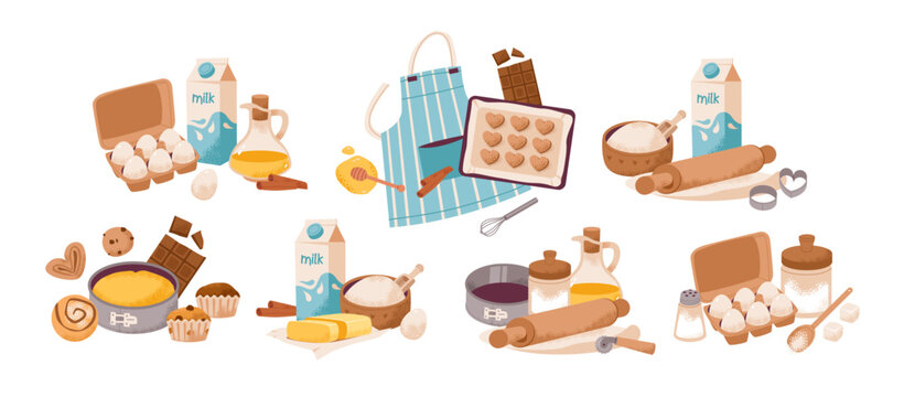 Baking supplies, eggs, flour, and a baking tray, homemade preparation. Gourmet and culinary illustrations set. Homemade cooking, pastry preparation. Flat vector illustration.