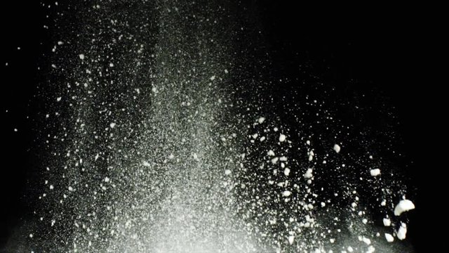 Explosion of white flour on black background. Stock footage. Explosion of thick cloud of white powder with crumbling particles on black isolated background