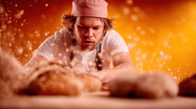 A dedicated baker passionately works with dough in a warm environment, embodying the artistry and love behind crafting delicious baked goods and culinary creations.