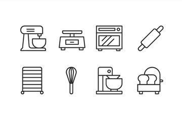 Set of simple kitchen web icons representing essential baking tools and equipment for home cooks and chefs