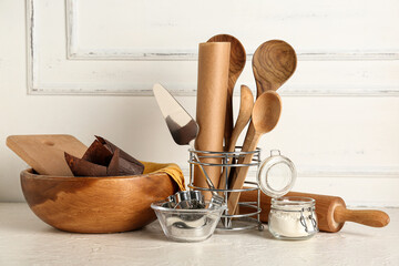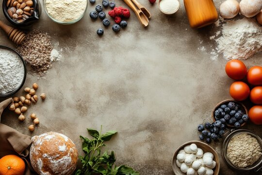 A variety of natural ingredients and baking supplies laid out on a kitchen counter for cooking
