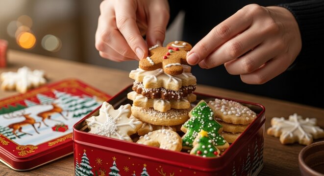 Hands stacking Christmas cookies in a festive red tin on a wooden table with holiday treats.