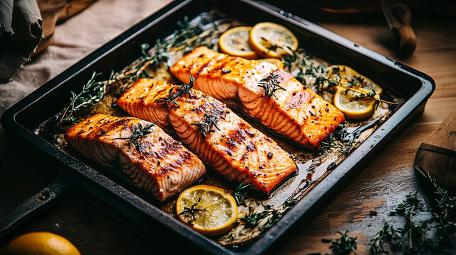 Delicious grilled salmon fillets seasoned and served on a baking tray