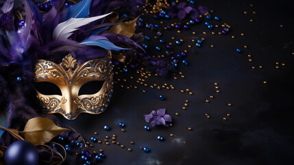 Élégant masque vénitien, avec des éléments décoratifs, violet et doré. Matière, beauté, carnaval. Venise. Pour conception et création graphique.
