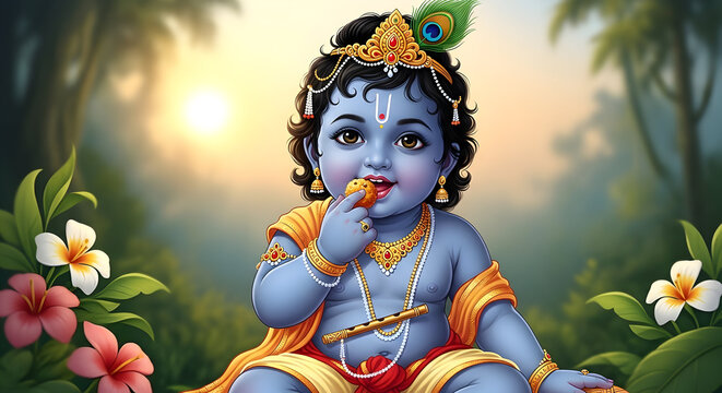 Cute Bal Krishna Eating Sweet Treat, Divine Child Lord Krishna in Nature Background, Janmashtami Festival Art