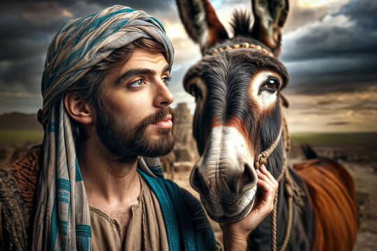 Numbers:Balaam’s Donkey,Numbers Donkey Speaking to Balaam, Supernatural Scene, Shocked Balaam, Angelic Intervention, Beige Background, Copyspace