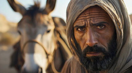 Man with a flowing beard and an old donkey traveling through an arid desert landscape in ancient Israel footage