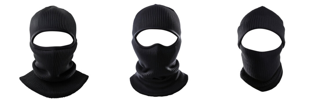 Gangster masks with images and inscriptions, stylish balaclavas with patterns in the form of gangster tattoos, stylish gangster masks from different angles (straight, side, perspective). Vector gang
