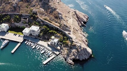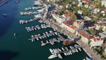 Aerial panoramic view of Balaklava landscape with boats and sea in marina bay. Crimea Sevastopol tourist attraction. Drone top view shot of port for luxury yachts, boats and sailboats.