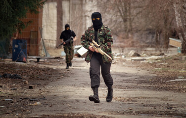 Soldier or terrorist man wearing balaklava mask running with sniper rifle in his hand on city battlefield