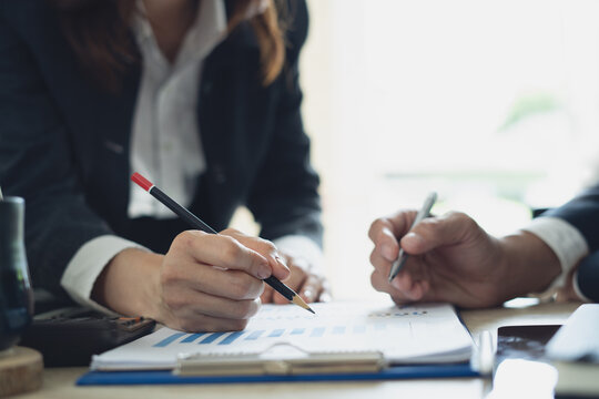 Pointing laptop, Meeting and consulting agenda of indian asia mixed race business man and female china half thai ethnicity bookkeepers discussing balance sheet, stock market profit with yearly tax.