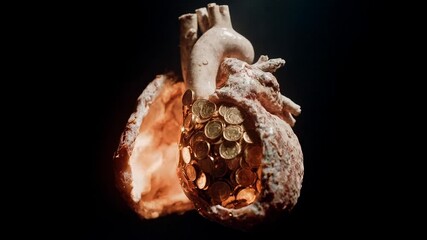 Human heart sculpted from coins glowing in darkness representing wealth health economics and fragile balance between money and life in dramatic conceptual studio lighting