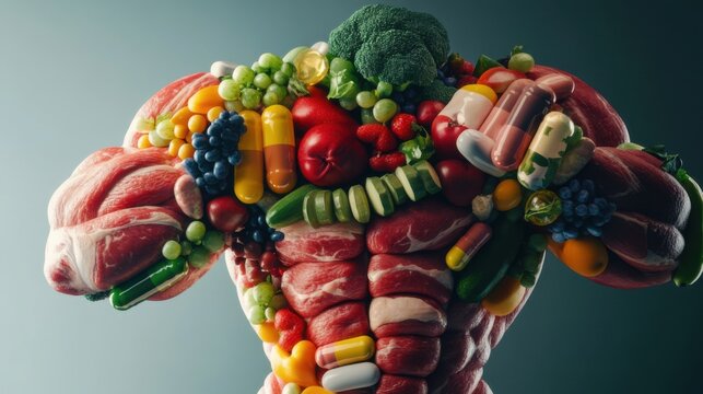 Colorful display of healthy foods and meats showcases balanced nutrition and strength concept in an artistic arrangement