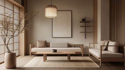 A modern living room with a neutral palette, soft textures, and a minimalist coffee table, creating a balanced and inviting mood