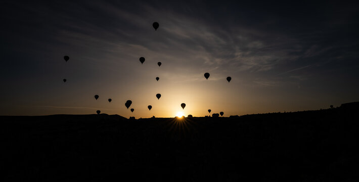 Landscape sunrise or sunset in Cappadocia with set hot air balloon fly in sky. Concept tourist travel Goreme Turkey.