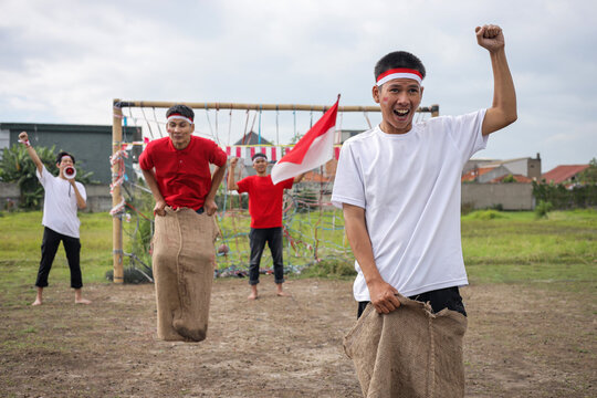 Group Of Young Indonesian Men Participating In Traditional Sack Race, Celebrating National Holiday With Laughter And Friendly Competition
