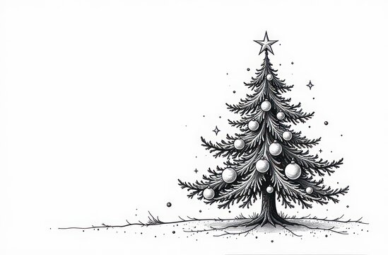 Christmas tree with Christmas balls on it on the white background. Balck and white image