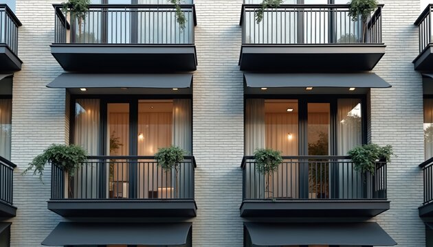 Modern apartment building facade features balconies with rich green plants and sleek grey awnings. Building exterior showcases contemporary architecture with brickwork and large windows.