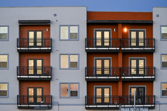 Modern apartment building exterior featuring expansive windows, balconies against clear sky. Architectural marvel contemporary urban living with sleek facades, inviting residential spaces.
