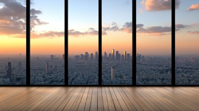 Sunset view from modern apartment balcony overlooking lush greenery and serene water body