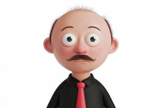 A 3D cartoon depiction of a bald, mustachioed man in a black shirt and red tie, looking surprised.