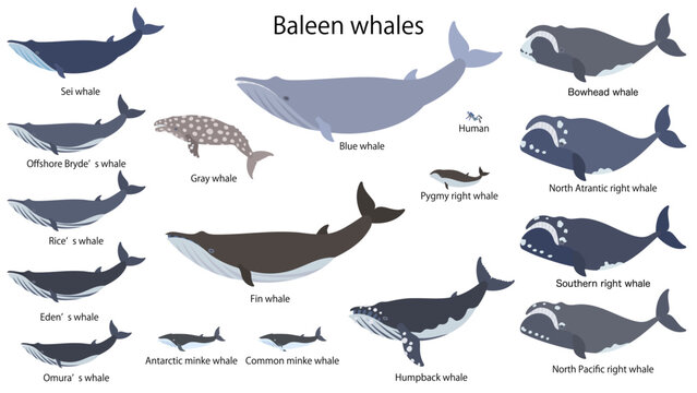 ヒゲクジラ類の鯨16種類。フラットなベクターイラストセット。大きさを比較したイラスト。