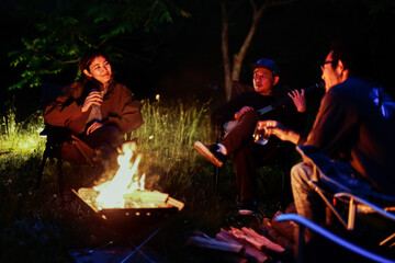 A group of friends having fun in front of the campfire