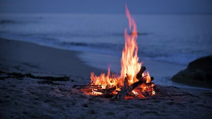 A campfire burns on a deserted sandy beach at the seashore in the evening