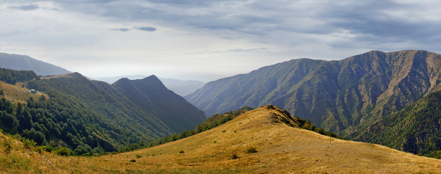 Incredable sunset in the durmitor national park in Montenegro during autumn season with golden fall colors on the trees with mountain huts scattered in the hills