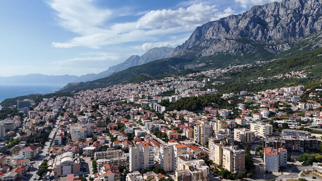 Picturesque summer view of Adriatic sea coast in Budva Riviera. Przno village with buildings on the rock at sunset warm sunlight, Montenegro
